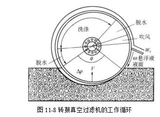 转鼓真空过滤机如图11-4所示,它的过滤表面通常位于圆柱形转鼓的外表面;然而, 有的转鼓真空过滤机的过滤面在转鼓内表面。在第二种情况中,过滤后的固体沉积在垂直圆 盘的外表面,如图11-5所示。