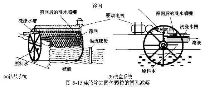 微孔筛分最普遍的应用是在饮用水和废水处理工业中,孔径为15?200μm的编织金属网或纤维织物安装在旋转转筒的外侧,转筒的一般直径为1?3.3m,长度为0.6?5Im.