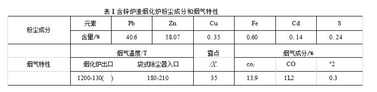 烟化炉粉尘成分和烟气特性列于表烟气先经过余热锅炉以回收热量并降低温度然后进入长袋低压脉冲袋式除尘器收尘.