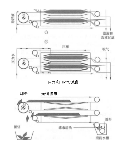 带式压榨过滤机是由两条无端滤带缠绕在一系列顺序排列,大小不等的辗轮上,利用滤带间的挤压和剪切作用脱除料浆中水分的一种过滤设备,又称为带式压滤机.