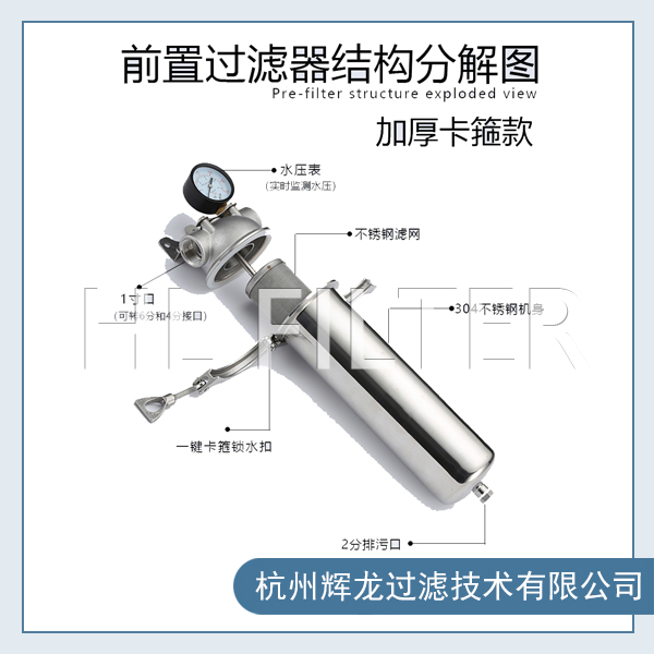 前置过滤器通常为“T”型结构。上面的“一横”的位置左右两端分别为进出水口。下面的“一竖”位置为机身和内部的筒形过滤网,最下端则为排污口,靠一个阀门来控制开启和关闭。滤网的...