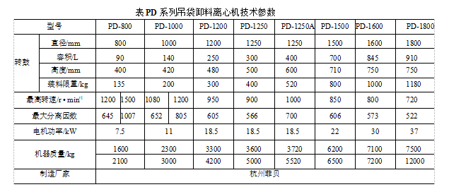 SD/PD系列吊袋上部卸料离心机技术参数见表