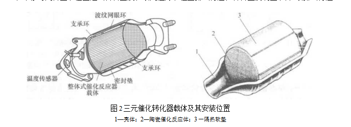发动机的三元催化装置主要包括催化反应器和电子控制系统。三元催化反应器的壳体内有细小的 蜂窝状隔板通道,通道表面涂以钳、紀、铐等贵金属起催化作用。图1为三元催化转化器的结构。