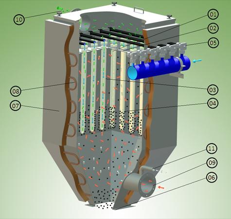 3、在每个过滤器元件的外表面④上收集颗粒和干擦洗吸附剂。它们包括PM 10,PM 2.5尺寸范围; 这些聚集。